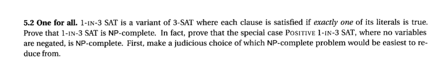 이 문제는 3-coloring 문제와 연관시켜 푸는게 좋다. 즉 3-coloring보다 1-in-3 sat이 더 어렵다는 것을 보이면 (즉 1-in-3-sat을 풀 수 있다면 3-coloring 을 풀 수 있다는 것을 보이면 된다.) 3-coloring이 np complete임을 아므로, 자연스럽게 증명이 된다. 3-coloring문제를 다음과 같이 해석해보자. 각 정점 v에 대해서 v의 색깔 red,blue,green에 대한 세 변수 Rv,Bv,Gv를 만든다. 이 변수는 v가 red라면 Rv만 true이고, 나머지는 false이다. 모든 색에 대해 동일하게 적용된다. 그렇다면 (Rv or Bv or Gv)라는 clause를 각 v에 대해 만든다. 그 후 모든 edge (a,b)에 대해 다음과 같은 clause들을 추가로 만든다. (Ra or Rb or Rab) (Ba or Bb or Bab) (Ga or Gb or Gab) 여기서 Rab, Bab,Gab는 dummy variable이다. 이렇다면 1-in-3 sat은 단 1개만 true여야 하기 때문에 Ra 나 Rb중 한 개만 true 일 수 있다. (이는 3-coloring문제와 동일) 마찬가지로 3-coloring과 동일하게 된다.
