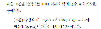 (1,1,0) (0,1,1) (0,0,1)은 너무 당연하게도 linearly independent한 vetor들이라서 원본 문제는 A^2+B^2+C^2=2n인 정수해를 찾는것과 동치이다.