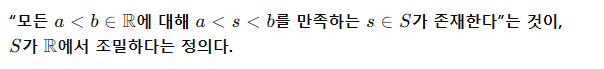 어떤 집합 S가 실수위에서 조밀하다는 것은 모든 a<b인 두 실수 a,b에 대해서 a<s<b를 만족하는 S의 원소 s가 있다는 뜻이다.