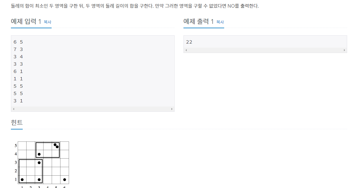 5.직사각형 하나를 고르면 2번 5번 영역에는 1번 dp를 3,4번 영역에는 2번 dp 를 이용해서 둘 중 비교하여 최소값을 1번 둘레에 더하면, 1번 직사각형을 골랐을때 최소 둘레이다.