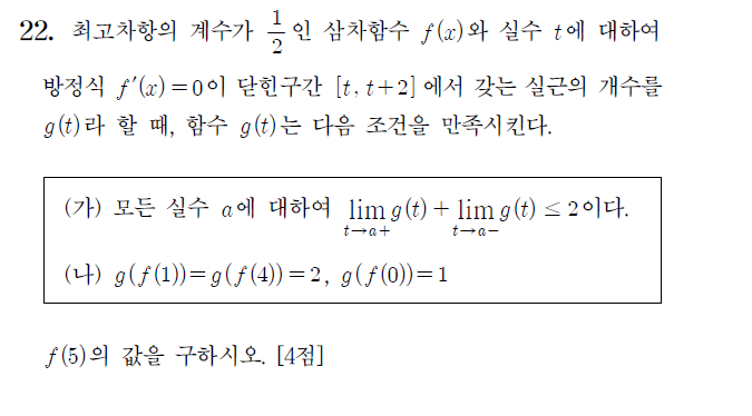 g(f(1))=2라는 건, f(x)의 극값이 t t+2에서 2개 나타나게 하는 t가 존재한다는 것.