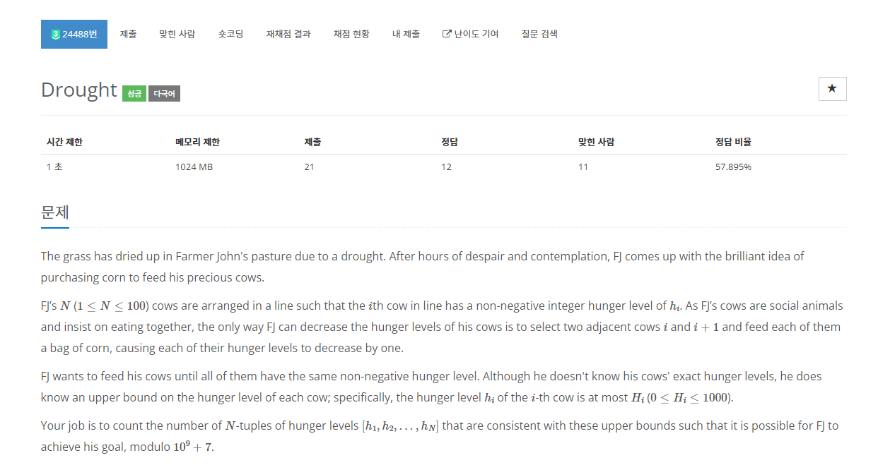 문제를 요약하면, 수열에서 인접한 두 수를 골라 1빼는 연산을 원하는 만큼 시행하여 수열의 모든 원소를 동일하게 만들 수 있도록 하는 수열의 개수 단 hi는 0이상 Hi이하 정수라는 제한 조건이 달려있다.